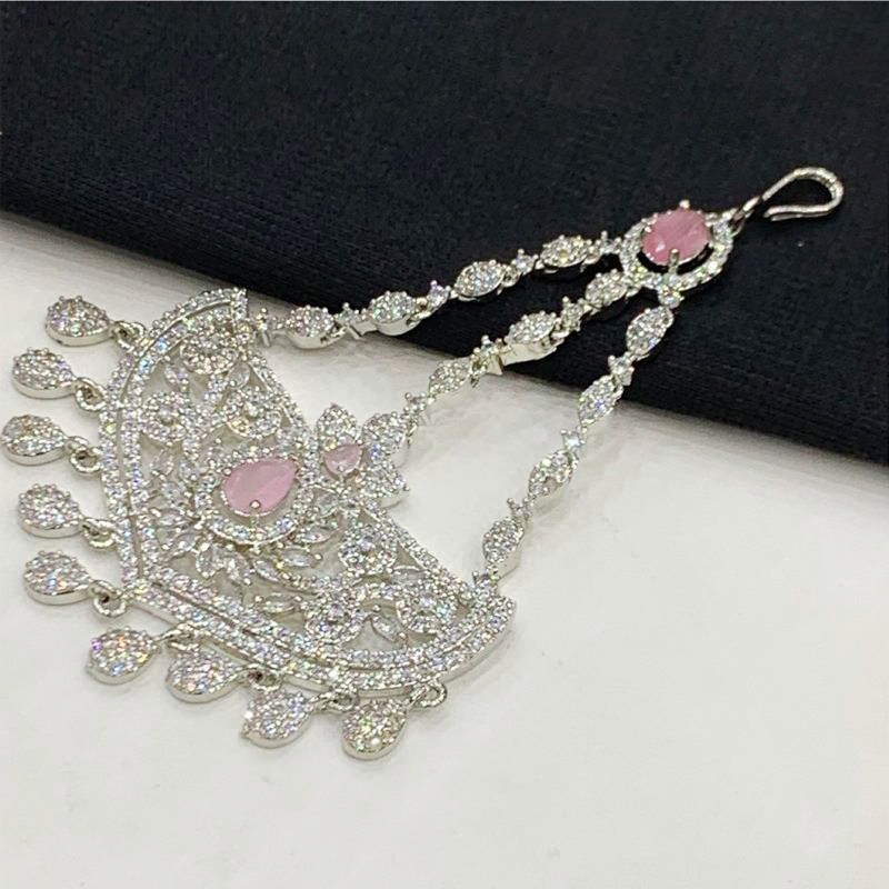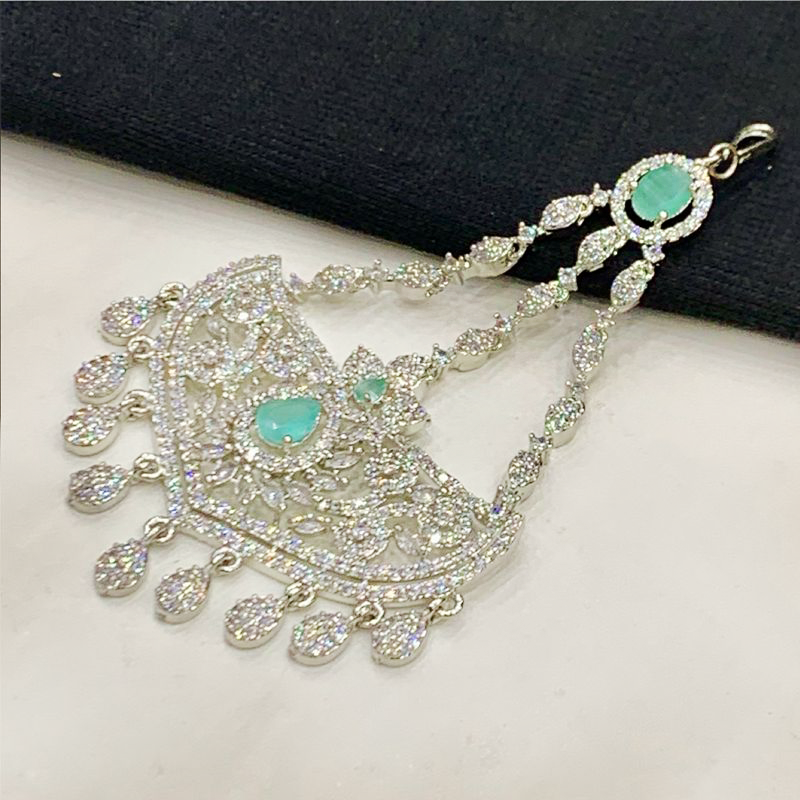 Adorn yourself with this breathtaking silver-toned tikka, a masterpiece of traditional elegance and modern sparkle. Designed in a graceful half-moon shape, it features intricate Kundan-inspired detailing beautifully studded with shimmering cubic zirconia crystals throughout. Dangling delicately from the lower edge are multiple teardrop-shaped crystal accents, adding movement and an enchanting sparkle. The tikka is complemented by elegant beaded chains, leading to a secure hook for effortless wear. Perfect for weddings, formal events, or any occasion where you want to make a captivating statement.