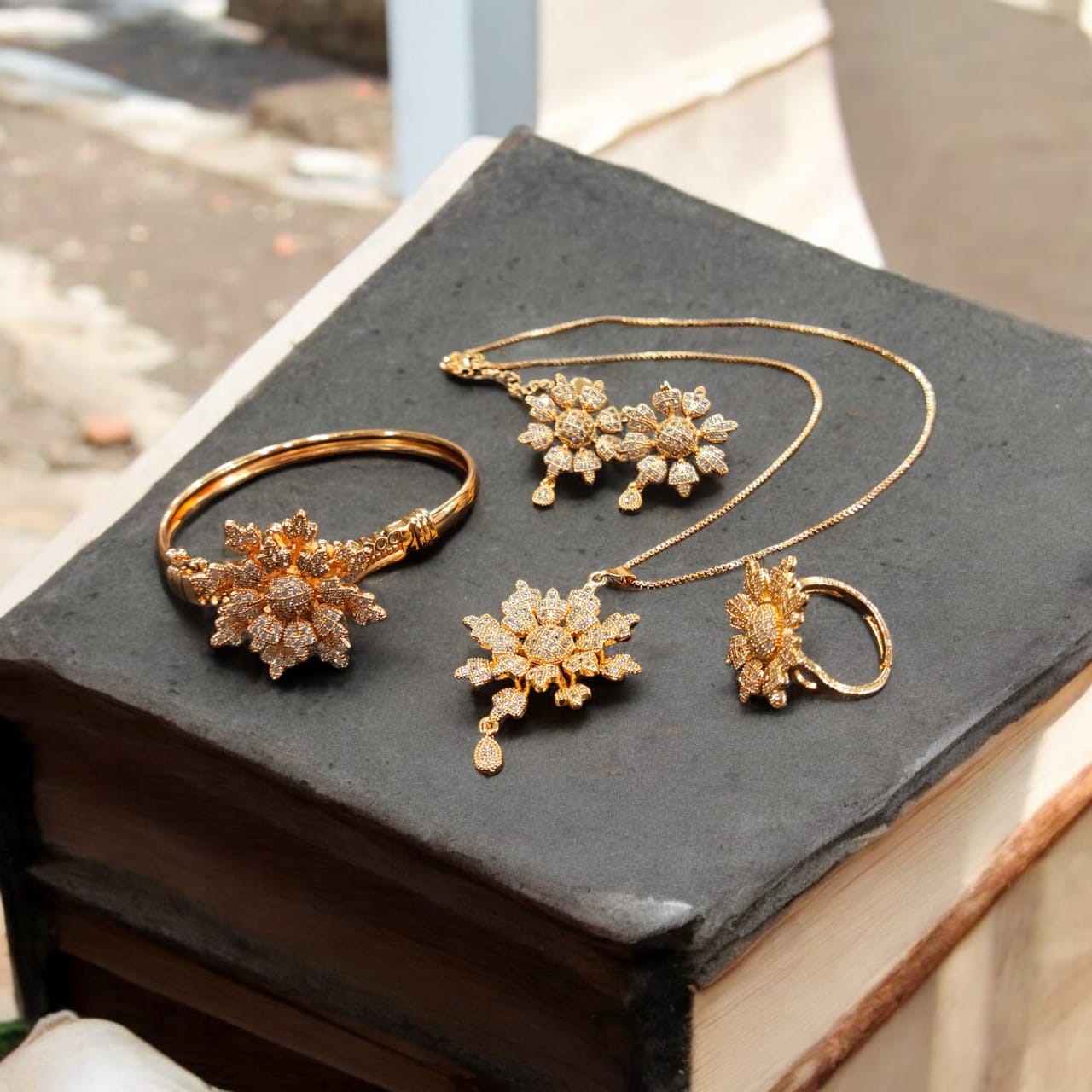 Dazzle with our Gold-Plated Snowflake Jewelry Set! 🌟 Features a necklace, matching earrings, and a chic bracelet, all adorned with sparkling zircon stones. ✨ Perfect for adding elegant sparkle to any outfit