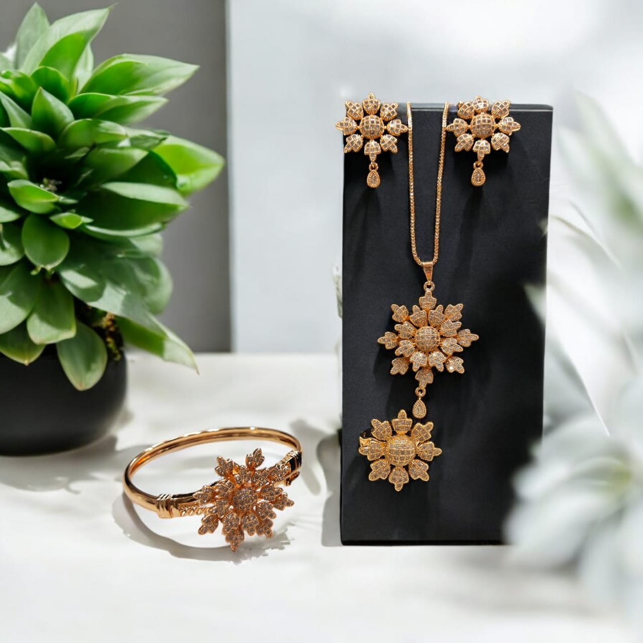 Indulge in the timeless allure of our Sparkling Snowflake Elegance Jewelry Set, a stunning collection designed to add a touch of winter wonderland magic to your look, no matter the season! ✨ This exquisite set features a beautiful gold-plated finish adorned with dazzling cubic zirconia stones that catch the light with every movement. The intricate snowflake design on the necklace pendant, matching earrings, and elegant bangle bracelet creates a cohesive and captivating ensemble. Perfect for special occasions, festive gatherings, or adding a sophisticated sparkle to your everyday style. This set makes an unforgettable gift for a loved one or a luxurious treat for yourself. Each piece is crafted with attention to detail, ensuring both beauty and durability