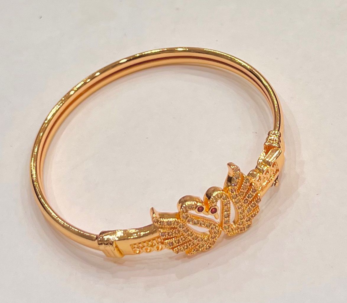 ✨ Golden bangle featuring an elegant swan couple with sparkling details and red gemstone eyes. Perfect for gifting or daily elegance! 🦢❤️