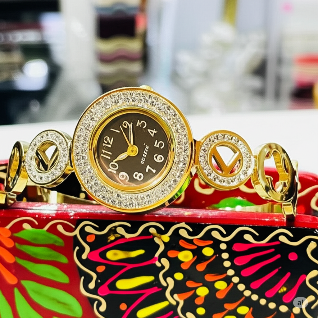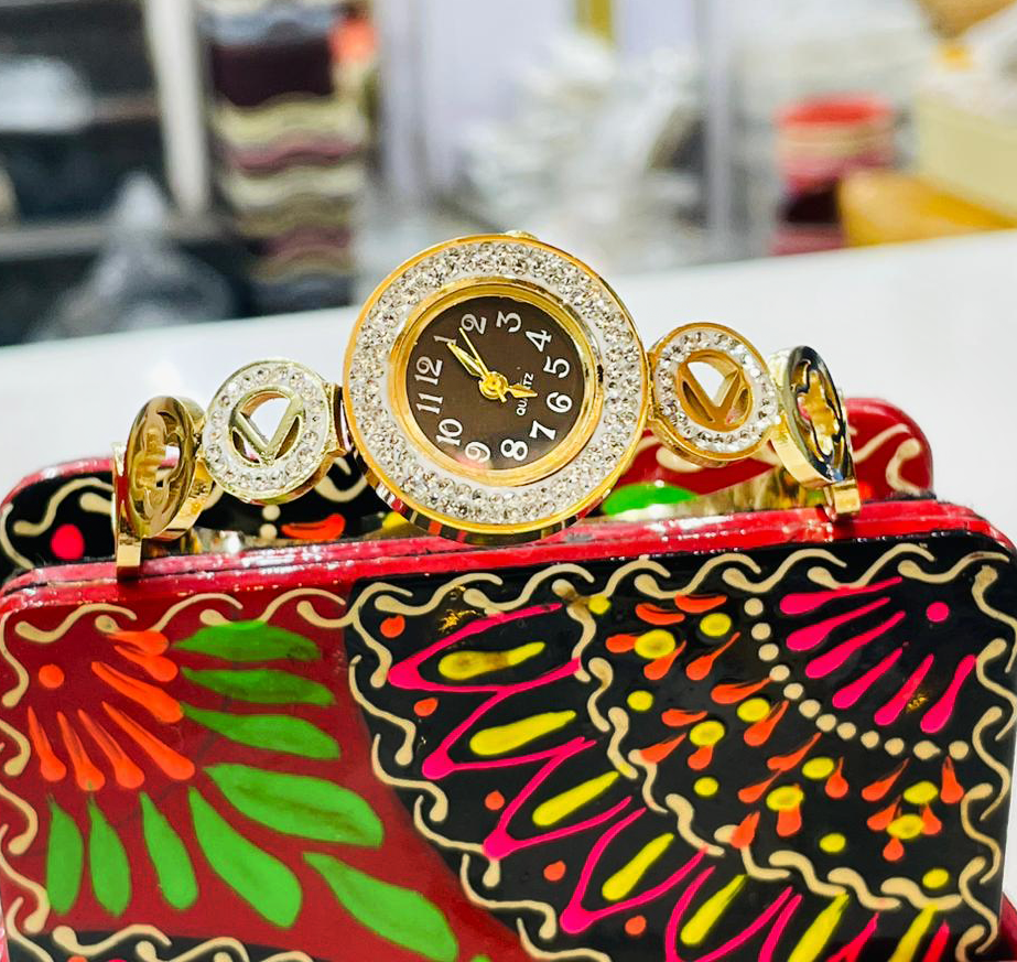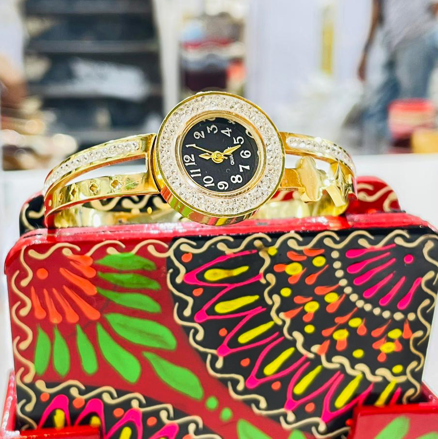 Make a statement with this luxurious gold designer wristwatch that blends elegance and sparkle. The round dial is surrounded by dazzling crystals, and the stylish bracelet strap features eye-catching circular cut-out designs, making it a true piece of art. Perfect for parties, festive wear, or adding shine to your daily outfit, this watch is more than just timekeeping — it’s jewelry with purpose!