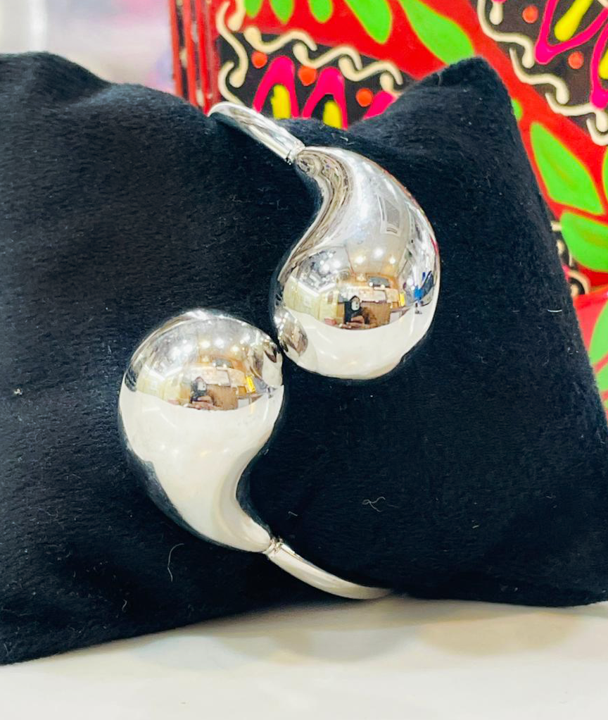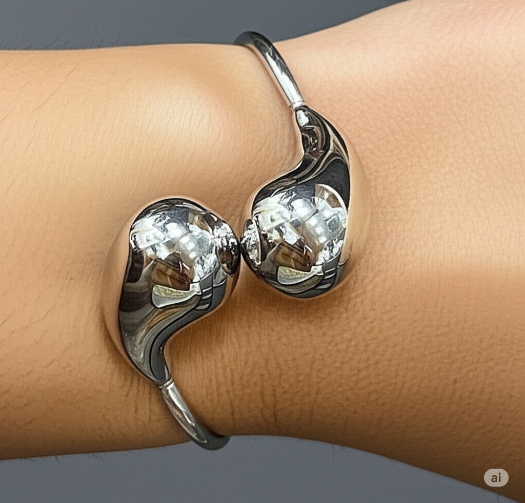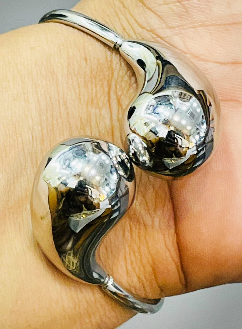 Elevate your fashion game with this contemporary silver cuff bracelet, designed for bold, artistic expression. Crafted with a sleek fluid shape, this open bracelet wraps elegantly around the wrist, creating a futuristic yet wearable accessory. Its high-shine metallic finish reflects light beautifully and adds a chic edge to any outfit, whether you’re dressing up for an evening out or adding flair to a casual day look. This bracelet is a true statement piece – bold, classy, and effortlessly cool. 🔥🌟