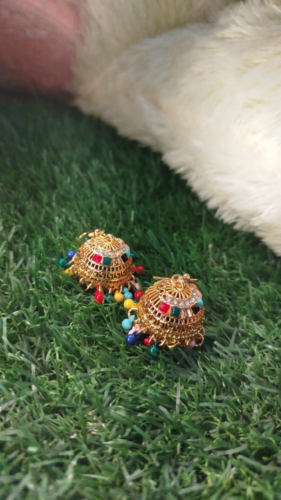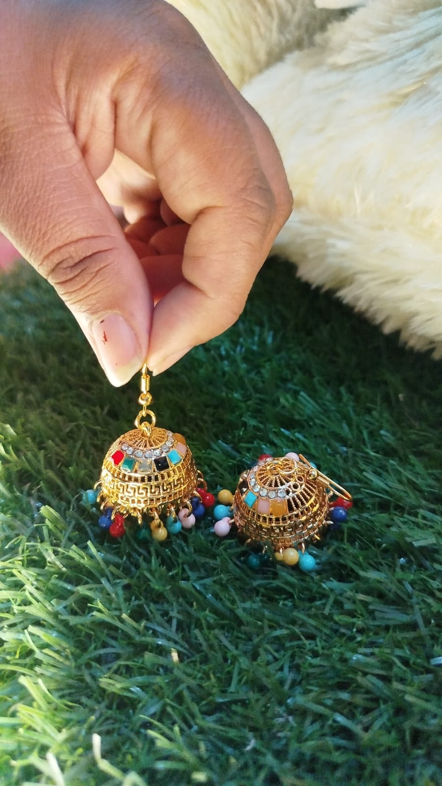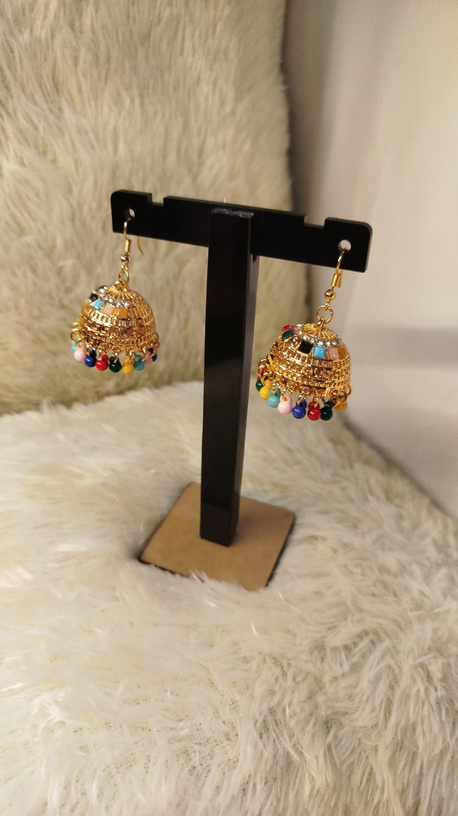 Traditional gold-tone jhumka earrings with multicolor beads – perfect for weddings, Eid & festive wear.